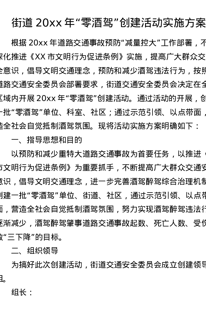 街道xx年零酒驾创建活动实施方案