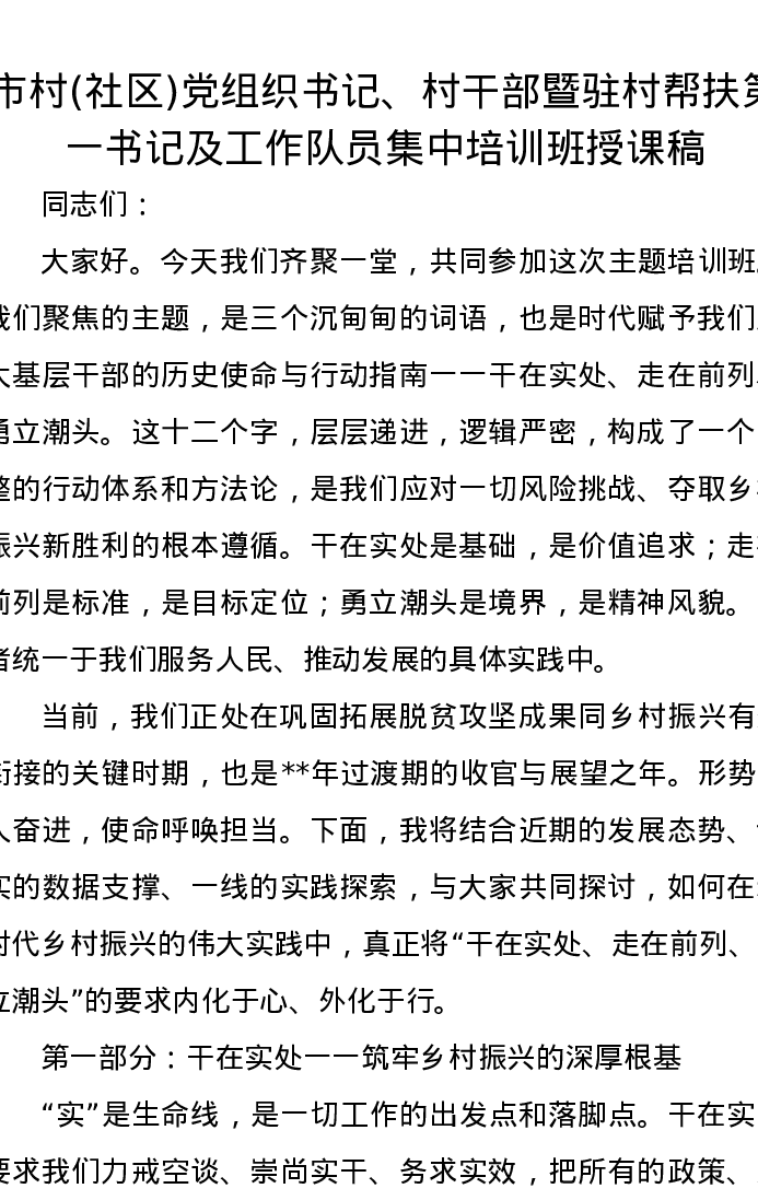 市村(社区)党组织书记、村干部暨驻村帮扶第一书记及工作队员集中培训班授课稿