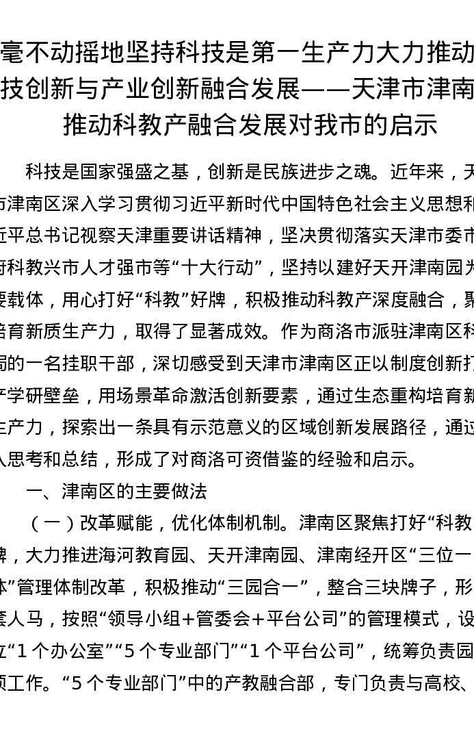毫不动摇地坚持科技是第一生产力 大力推动科技创新与产业创新融合发展——天津市津南区推动科教产融合发展对我市的启示