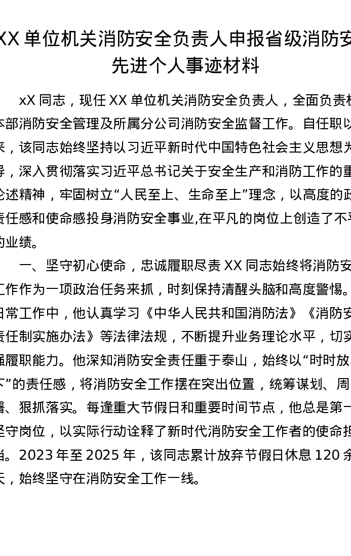 XX单位机关消防安全负责人申报省级消防安全先进个人事迹材料