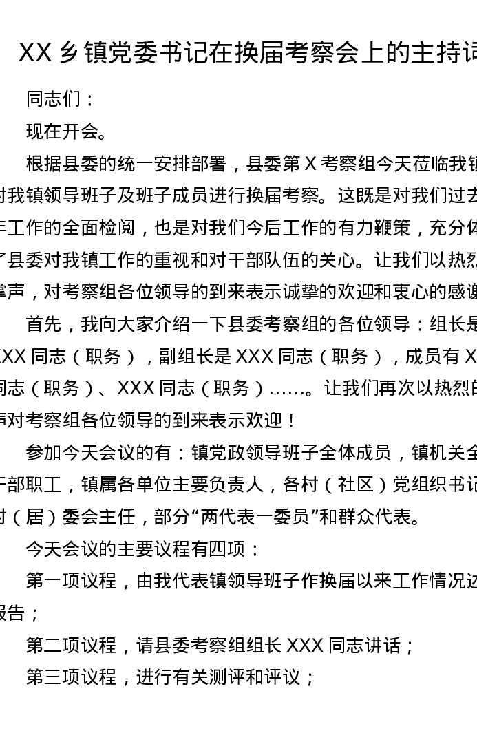 XX乡镇党委书记在换届考察会上的主持词
