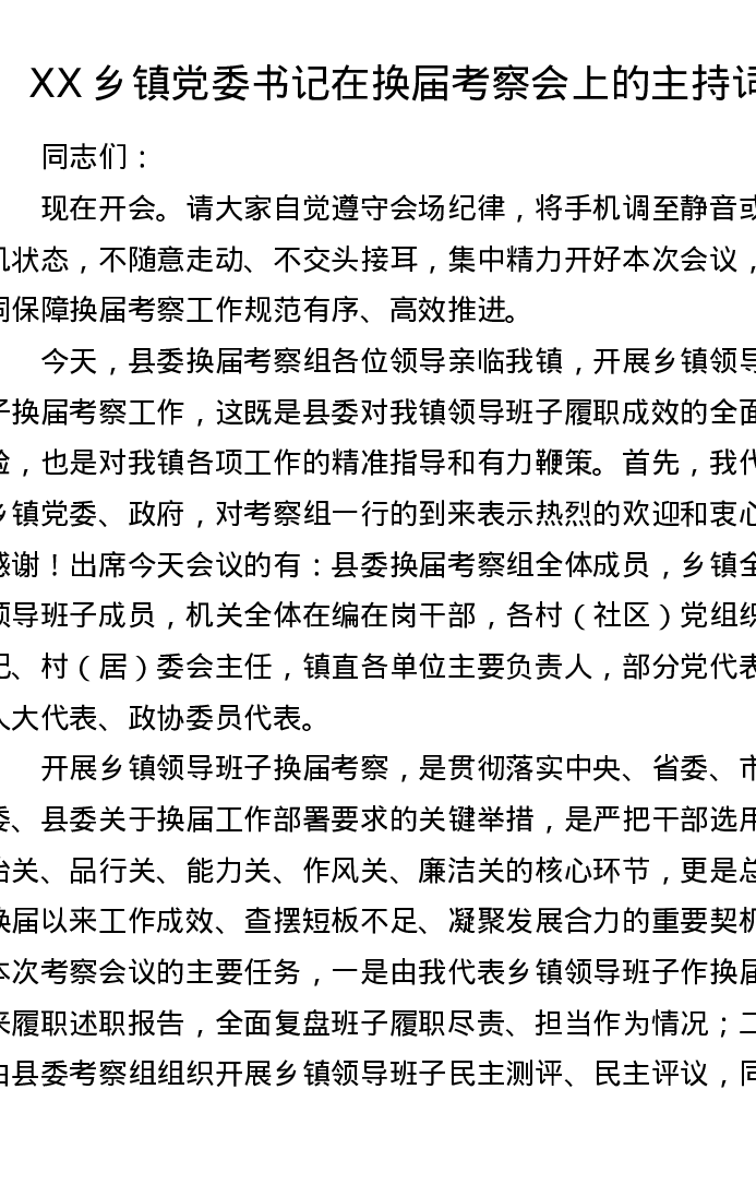 XX乡镇党委书记在换届考察会上的主持词2