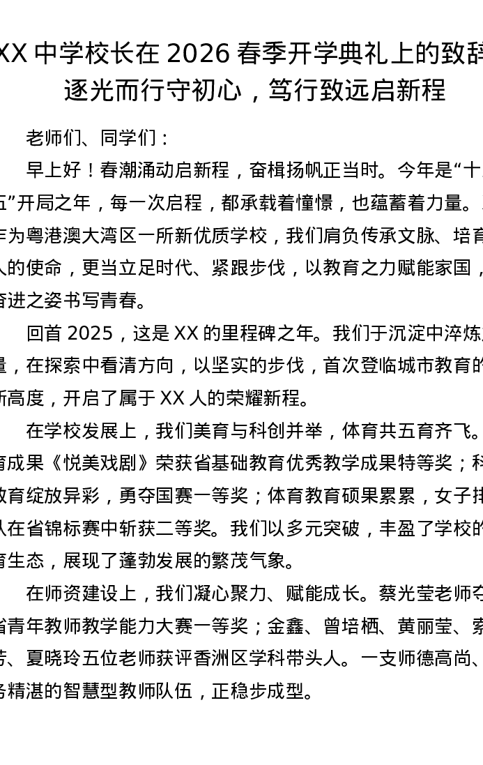 XX中学校长在2026春季开学典礼上的致辞:逐光而行守初心,笃行致远启新程