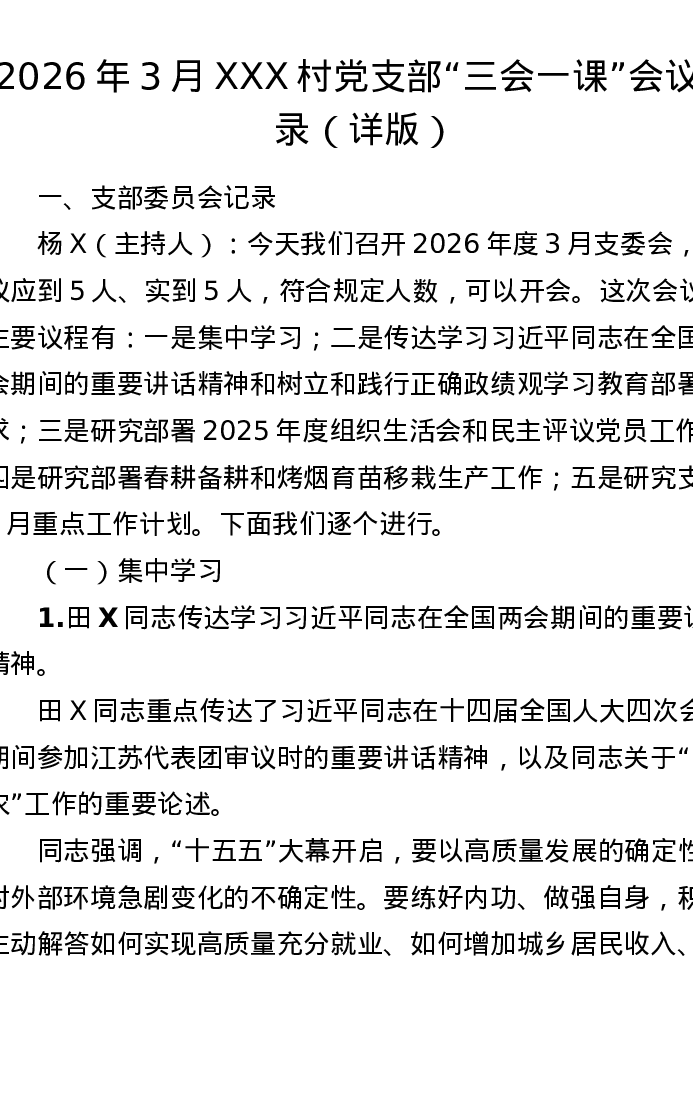 2026年3月XXX村党支部三会一课会议记录(详版)
