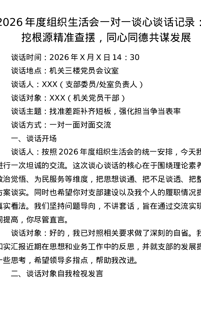 2026年度组织xxx一对一谈心谈话记录:深挖根源精准查摆,同心同德共谋发展