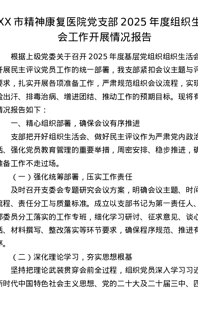 XX 市精神康复医院党支部 2025 年度组织xxx工作开展情况报告