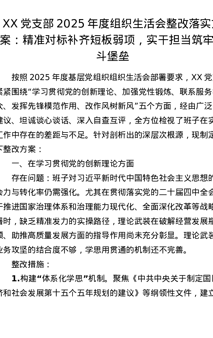 XX党支部2025年度组织xxx整改落实方案:精准对标补齐短板弱项,实干担当筑牢战斗堡垒