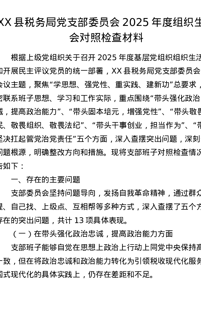XX县税务局党支部委员会2025年度组织xxx对照检查材料2