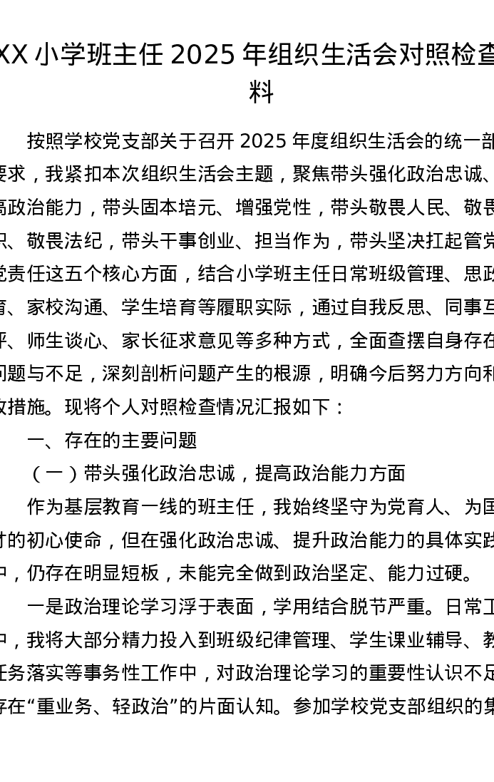 XX小学班主任2025年组织xxx对照检查材料
