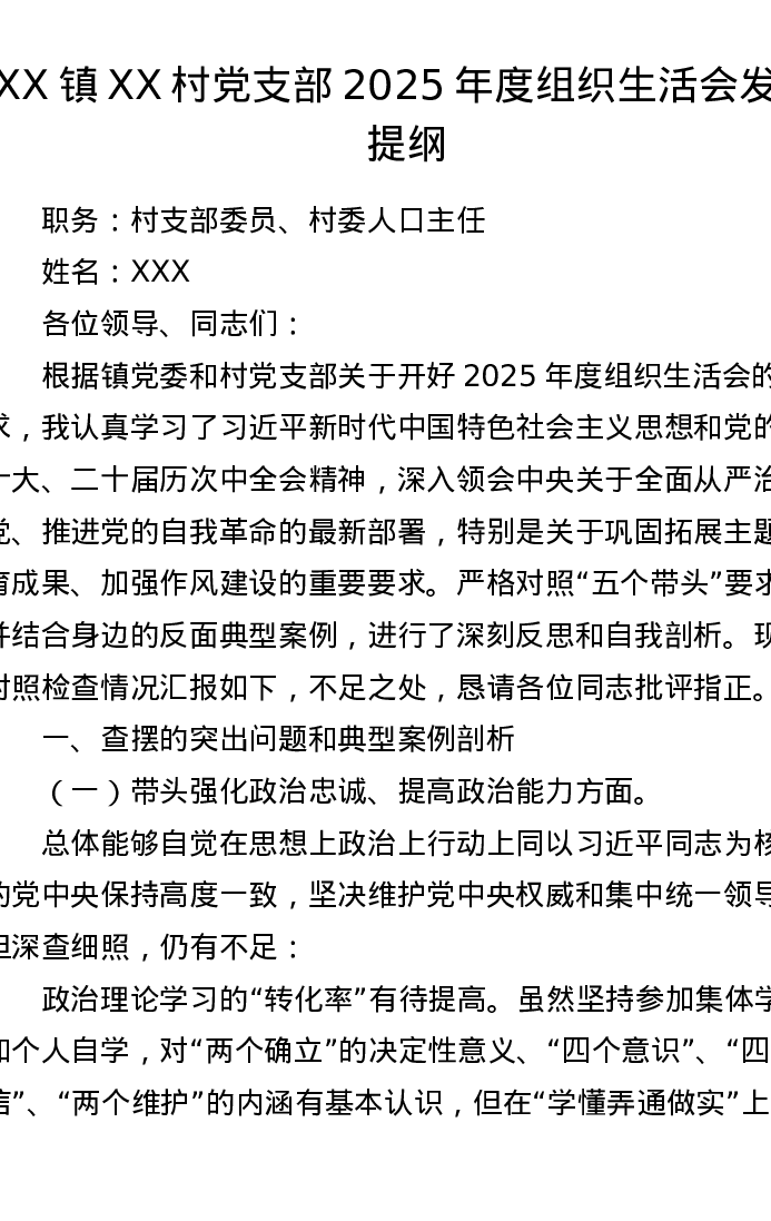 XX镇XX村党支部2025年度组织xxx发言提纲