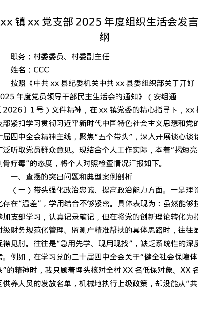 xx镇xx党支部2025年度组织xxx发言提纲