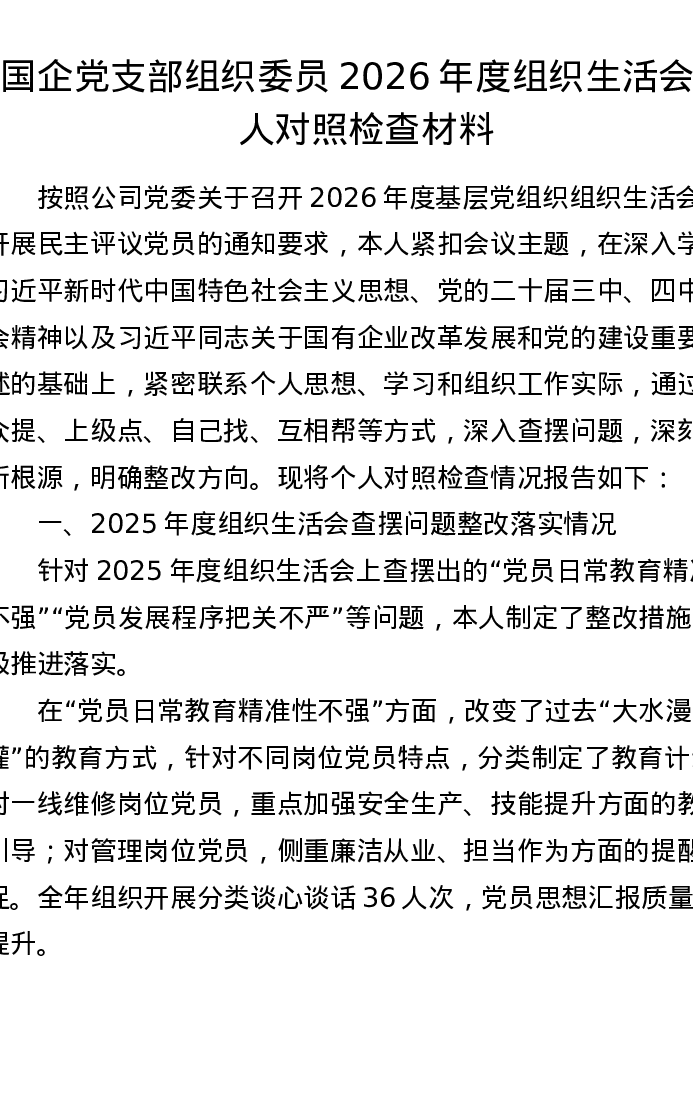 国企党支部组织委员2026年度组织xxx个人对照检查材料