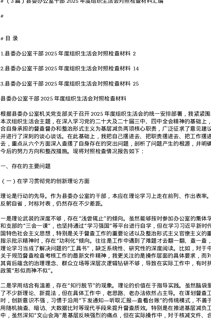 汇编:县委办公室干部2025年度组织xxx对照检查材料3篇