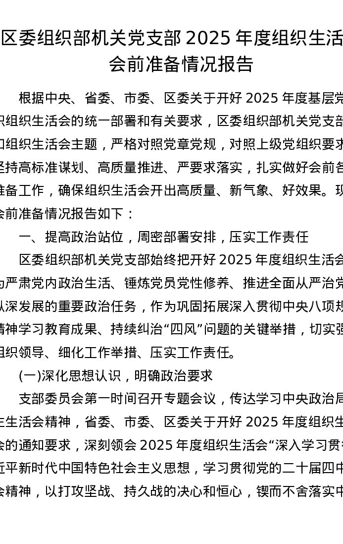 区委组织部机关党支部 2025 年度组织xxx会前准备情况报告