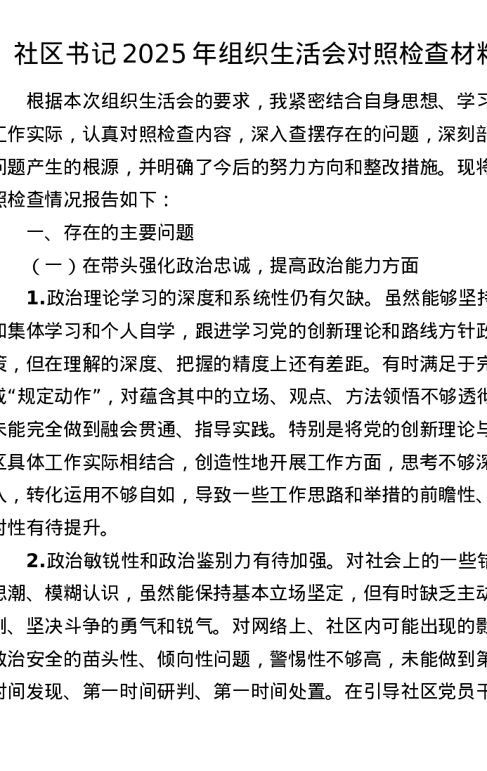 社区书记2025年组织xxx对照检查材料