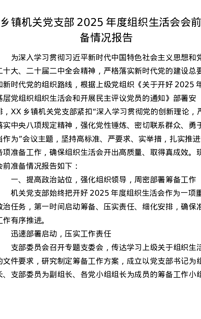 乡镇机关党支部2025年度组织xxx会前准备情况报告