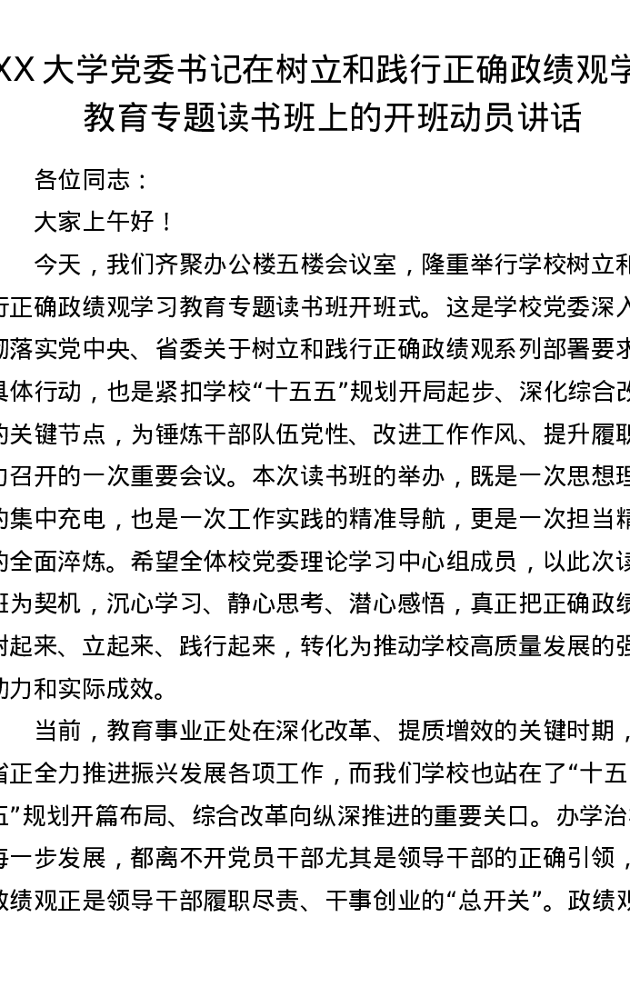 XX大学党委书记在树立和践行正确ZJG学习教育专题读书班上的开班动员讲话(10150字)