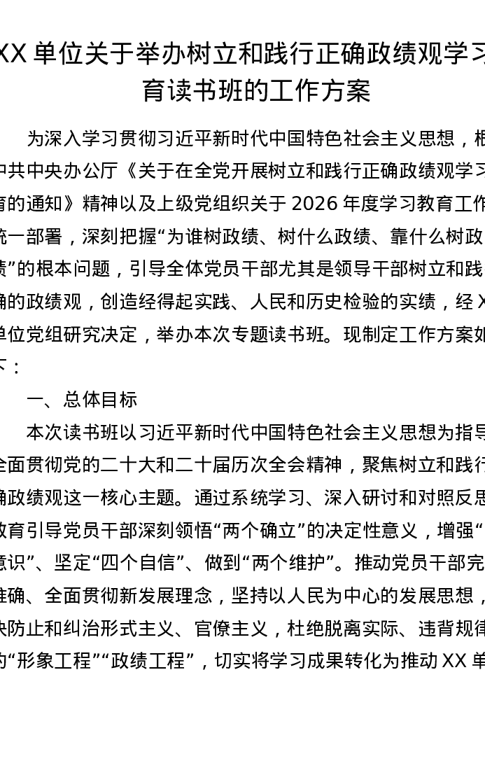 XX单位关于举办树立和践行正确ZJG学习教育读书班的工作方案