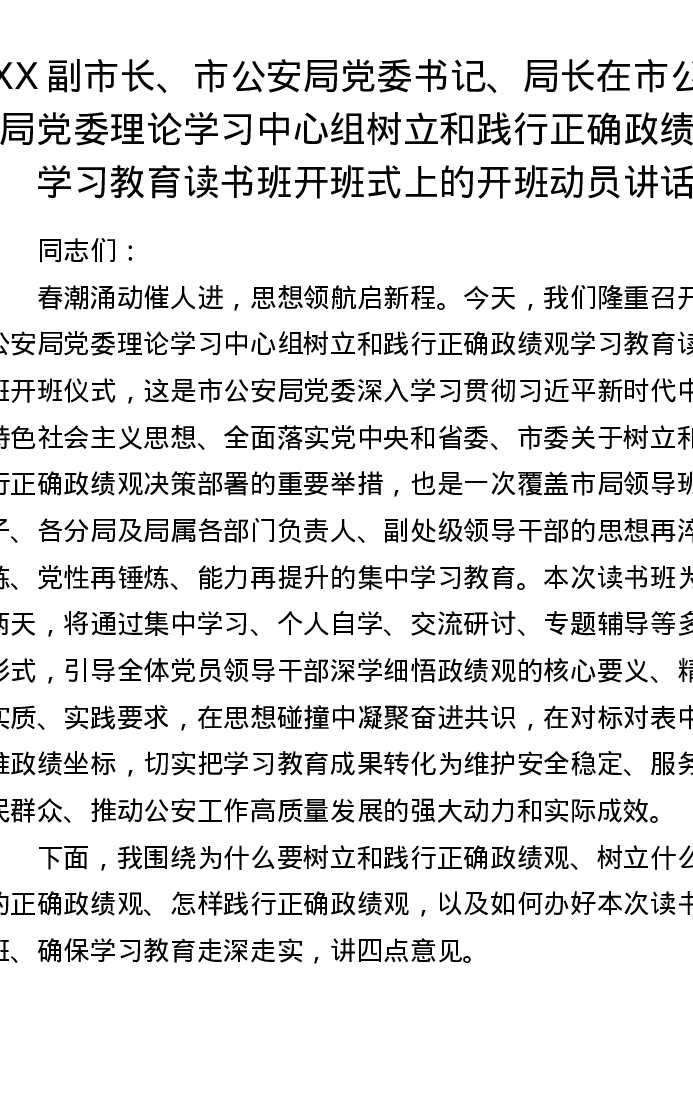 XX副市长、市公安局党委书记、局长在市公安局党委理论学习中心组树立和践行正确ZJG学习教育读书班开班式上的开班动员讲话