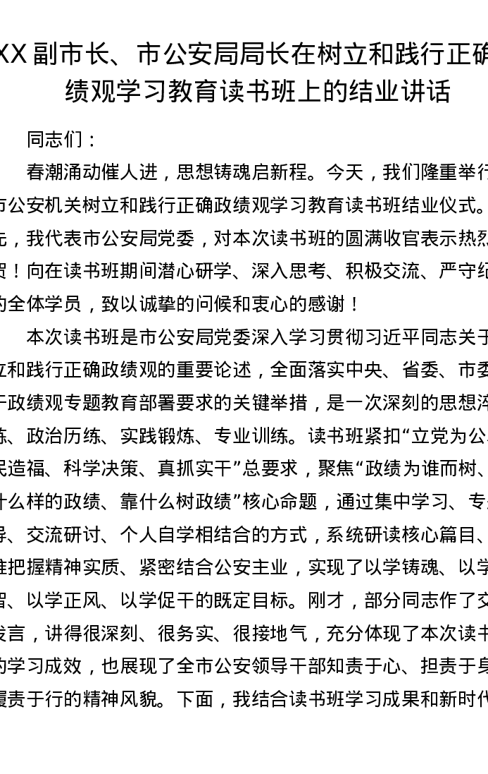 XX副市长、市公安局局长在树立和践行正确ZJG学习教育读书班上的结业讲话3