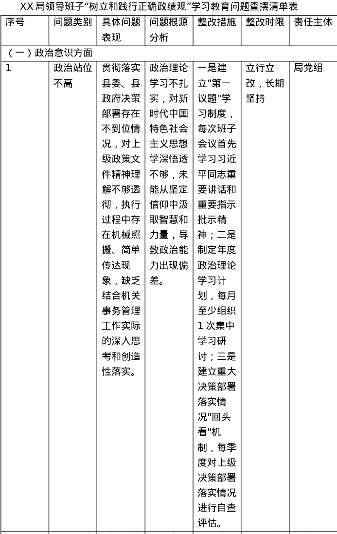 XX局领导班子树立和践行正确ZJG学习教育问题查摆清单(表格)
