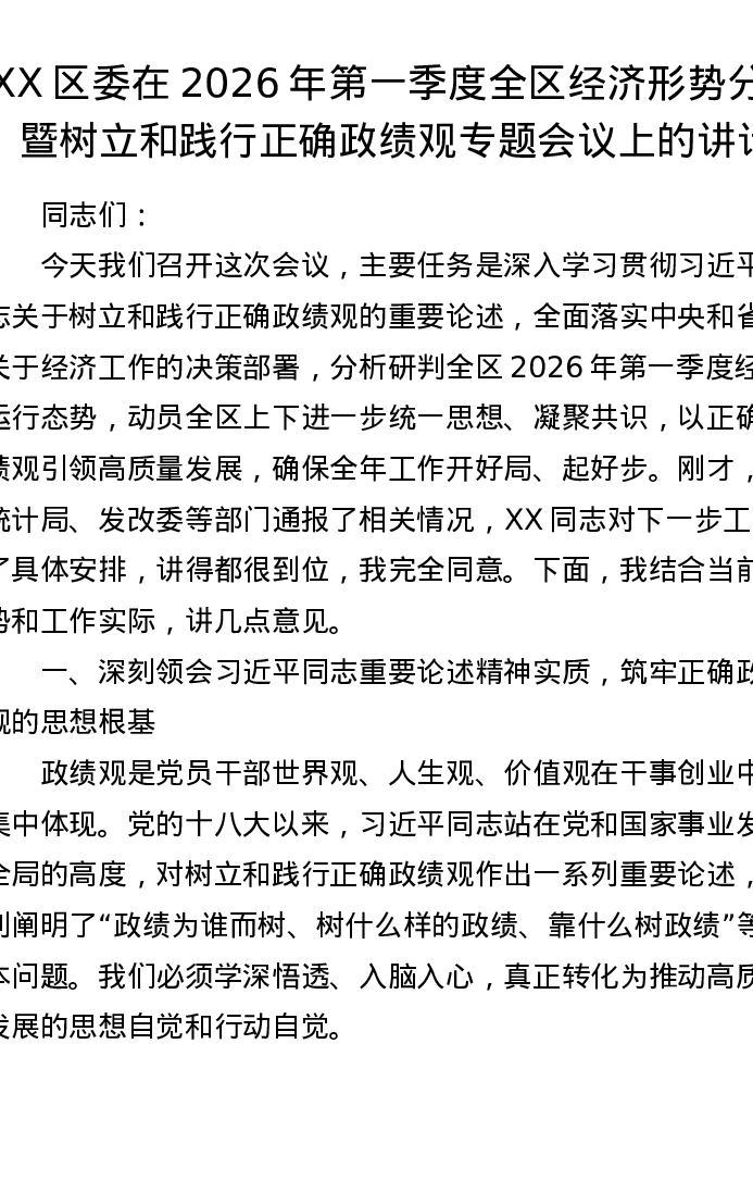 XX区委在2026年第一季度全区经济形势分析暨树立和践行正确ZJG专题会议上的讲话