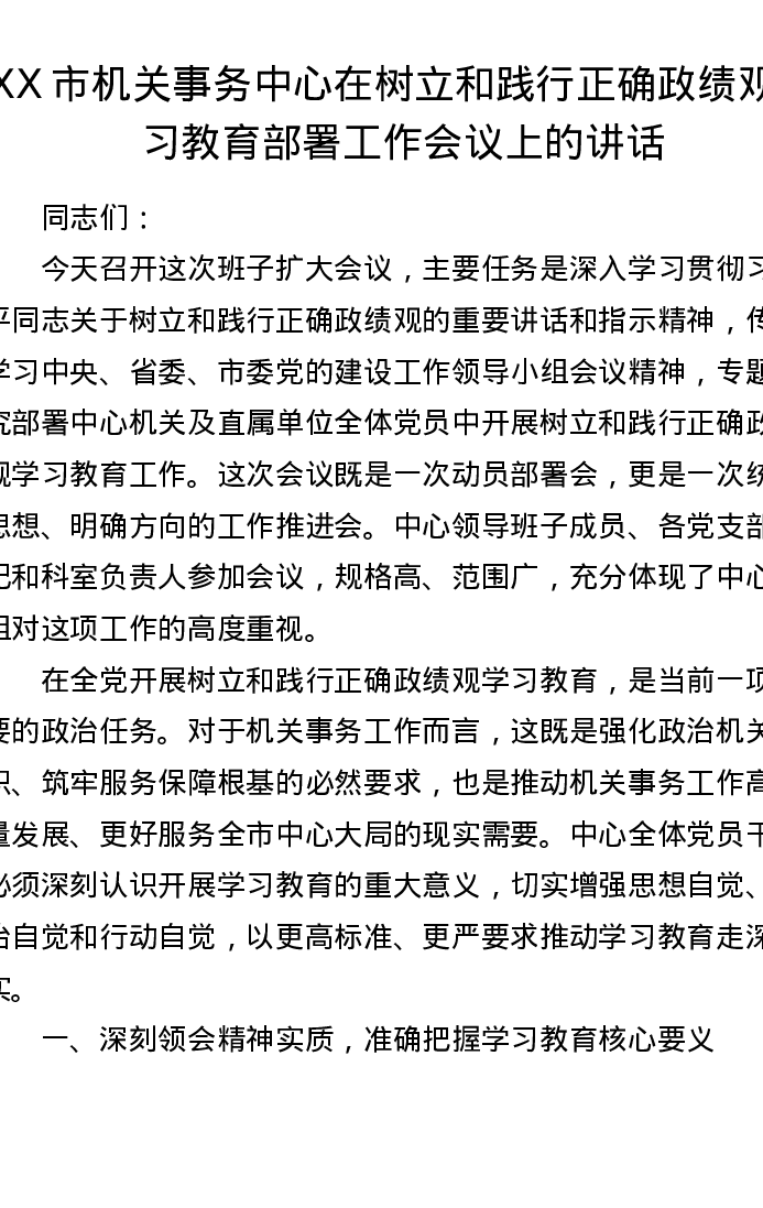 XX市机关事务中心在树立和践行正确ZJG学习教育部署工作会议上的讲话