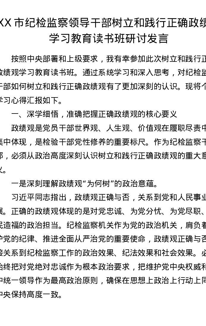 XX市纪检监察领导干部树立和践行正确ZJG学习教育读书班研讨发言