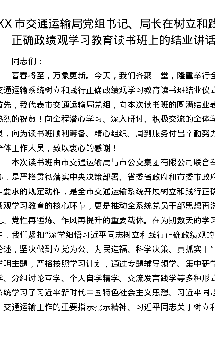 XX市交通运输局党组书记、局长在树立和践行正确ZJG学习教育读书班上的结业讲话