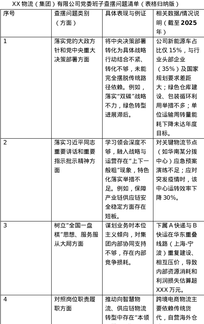 XX物流(集团)有限公司党委班子树立和践行正确ZJG学习教育查摆问题清单(表格)