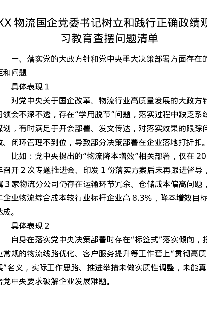 XX物流国企党委书记树立和践行正确ZJG学习教育查摆问题清单