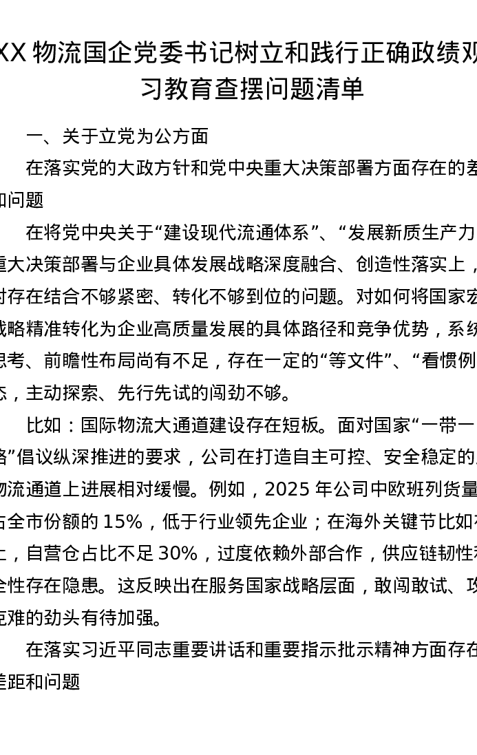 XX物流国企党委书记树立和践行正确ZJG学习教育查摆问题清单2