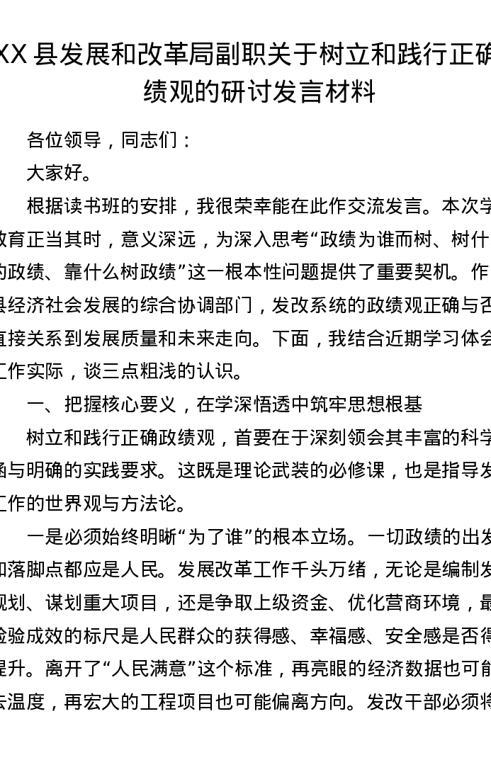 XX县发展和改革局副职关于树立和践行正确ZJG的研讨发言材料