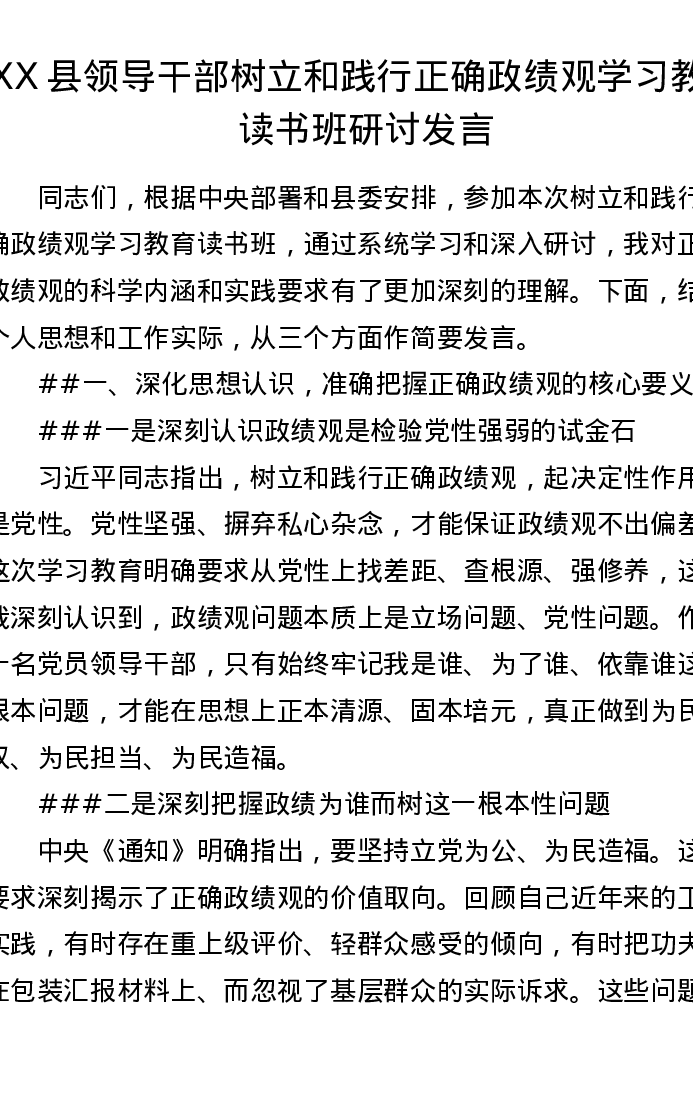 XX县领导干部树立和践行正确ZJG学习教育读书班研讨发言