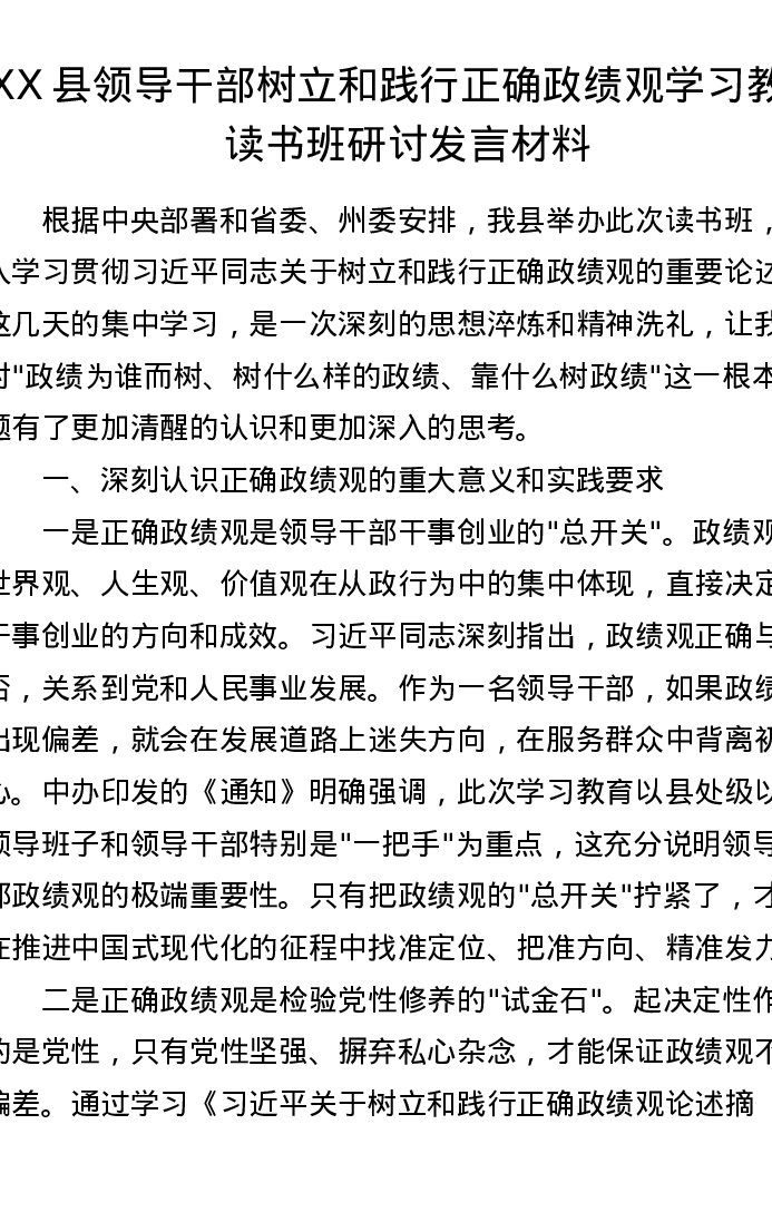 XX县领导干部树立和践行正确ZJG学习教育读书班研讨发言材料