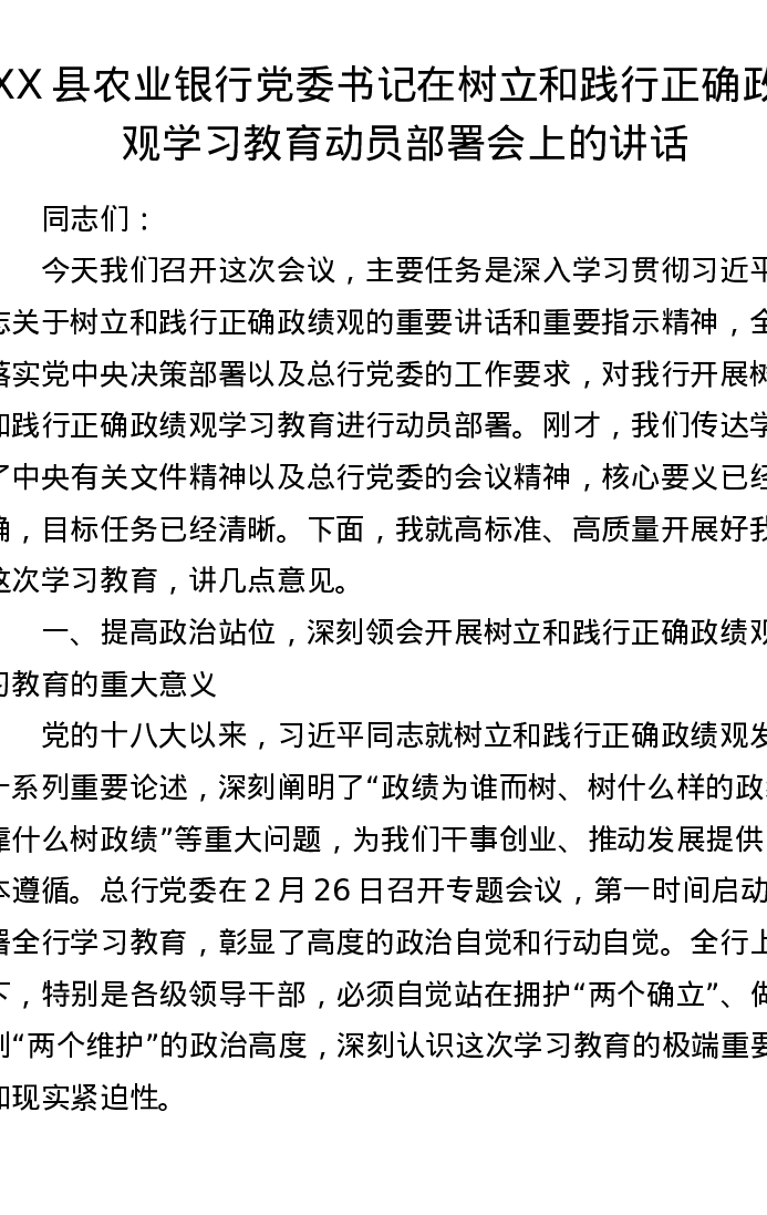 XX县农业银行党委书记在树立和践行正确ZJG学习教育动员部署会上的讲话2