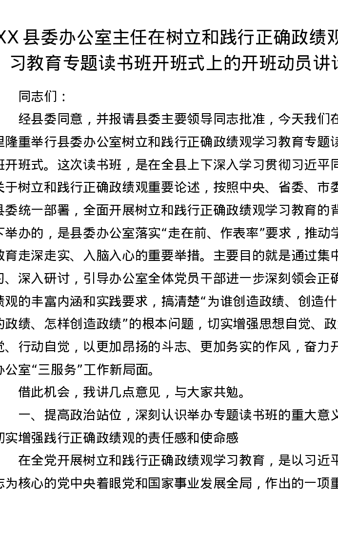 XX县委办公室主任在树立和践行正确ZJG学习教育专题读书班开班式上的开班动员讲话