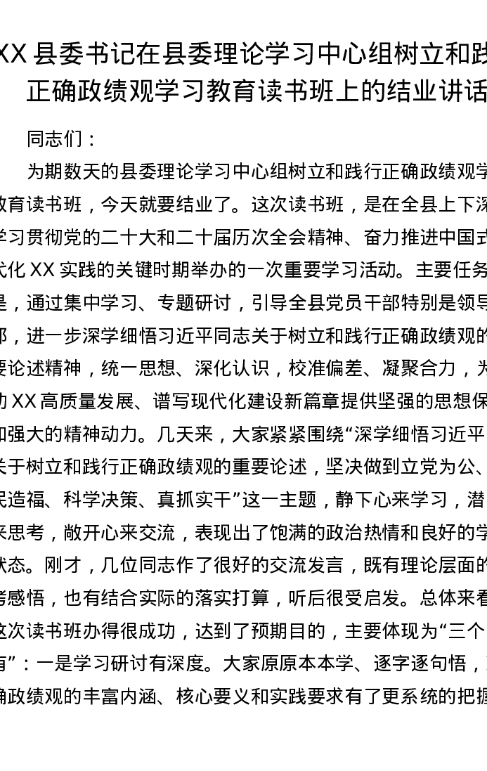 XX县委书记在县委理论学习中心组树立和践行正确ZJG学习教育读书班上的结业讲话2