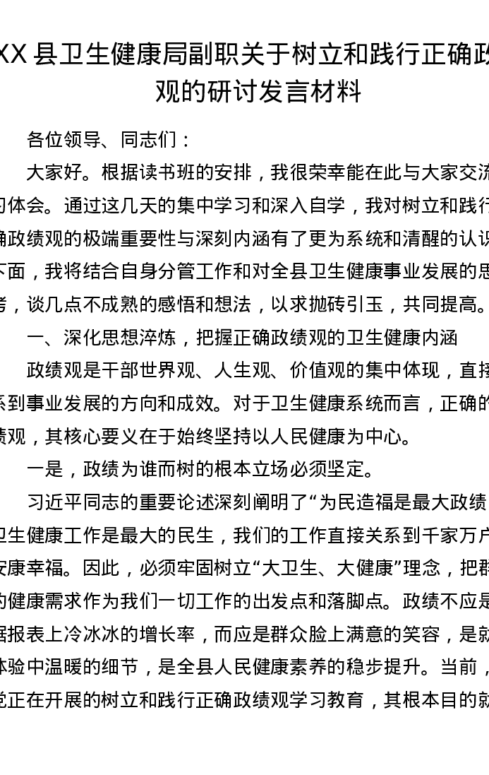 XX县卫生健康局副职关于树立和践行正确ZJG的研讨发言材料