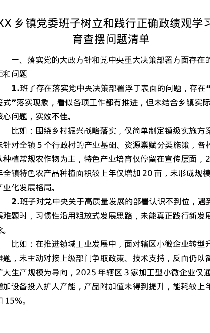 XX乡镇党委班子树立和践行正确ZJG学习教育查摆问题清单