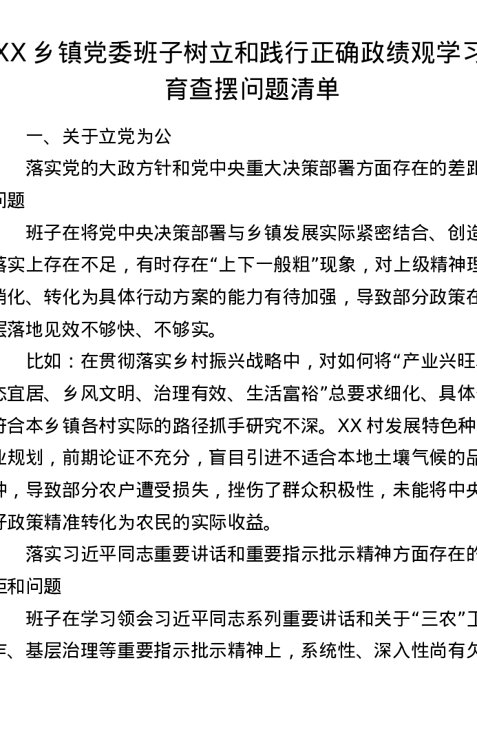 XX乡镇党委班子树立和践行正确ZJG学习教育查摆问题清单2