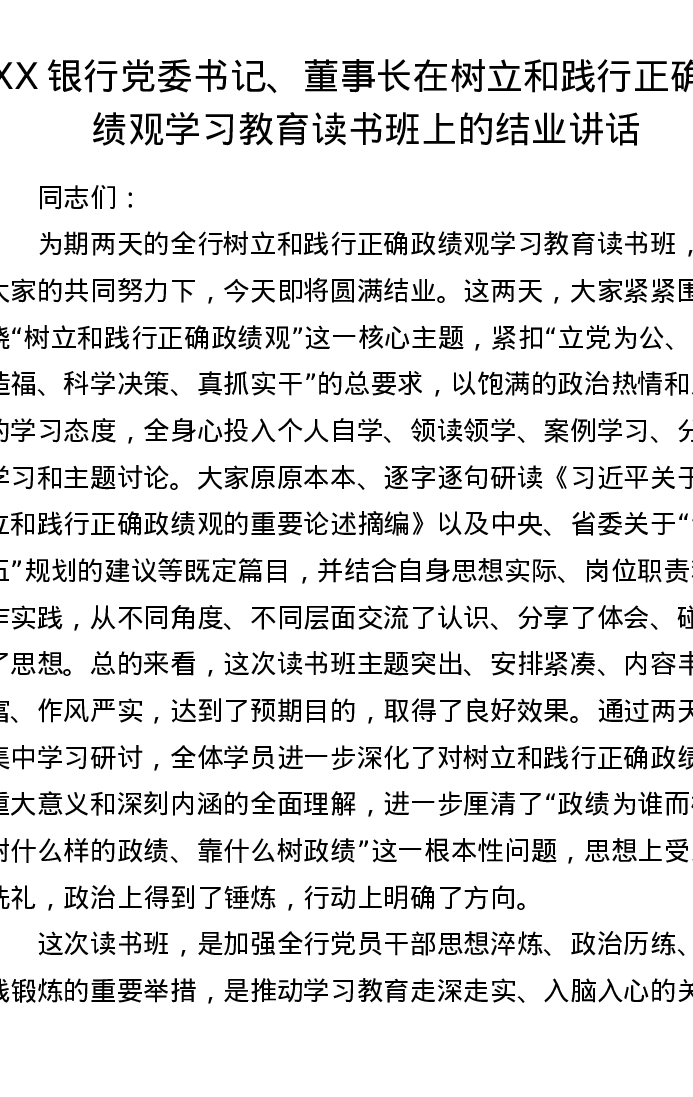 XX银行党委书记、董事长在树立和践行正确ZJG学习教育读书班上的结业讲话