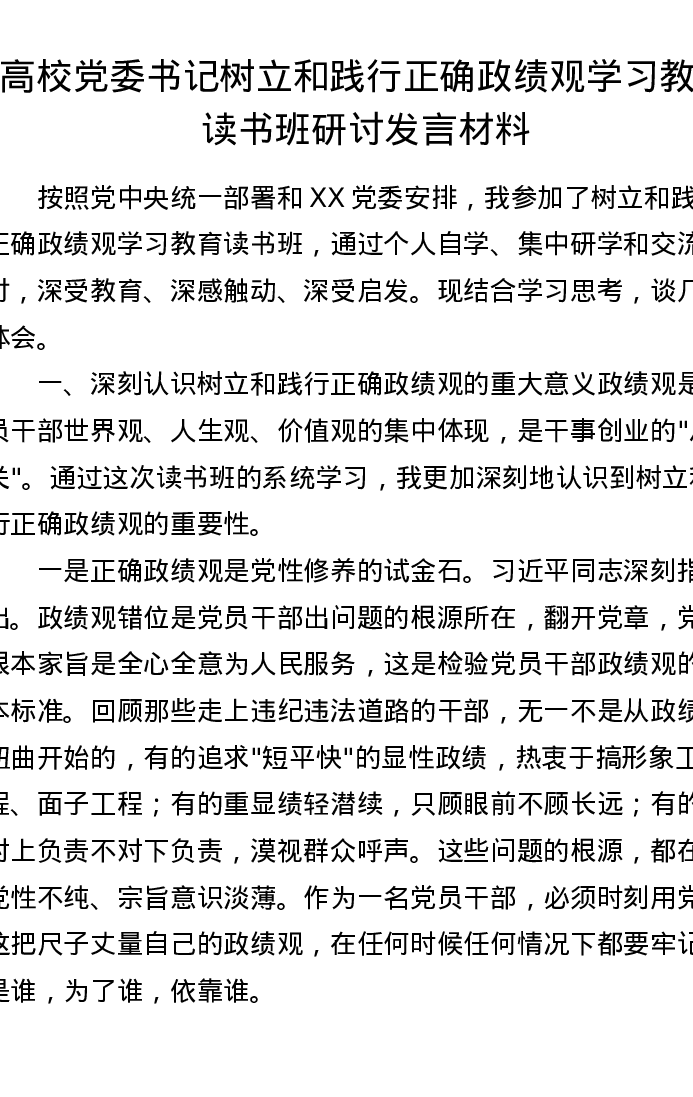 高校党委书记树立和践行正确ZJG学习教育读书班研讨发言材料