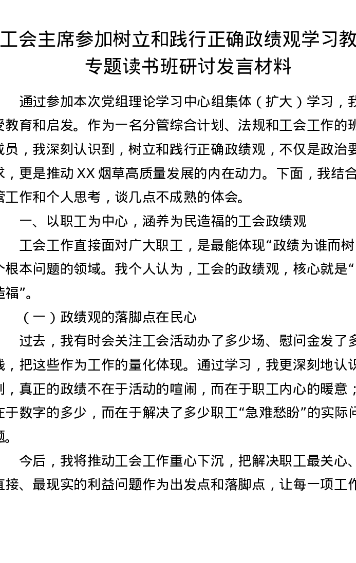 工会主席参加树立和践行正确ZJG学习教育专题读书班研讨发言材料