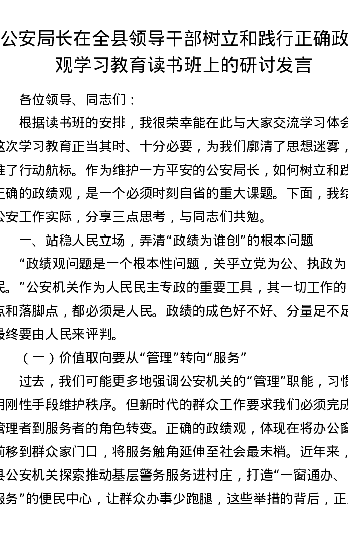 公安局长在全县领导干部树立和践行正确ZJG学习教育读书班上的研讨发言