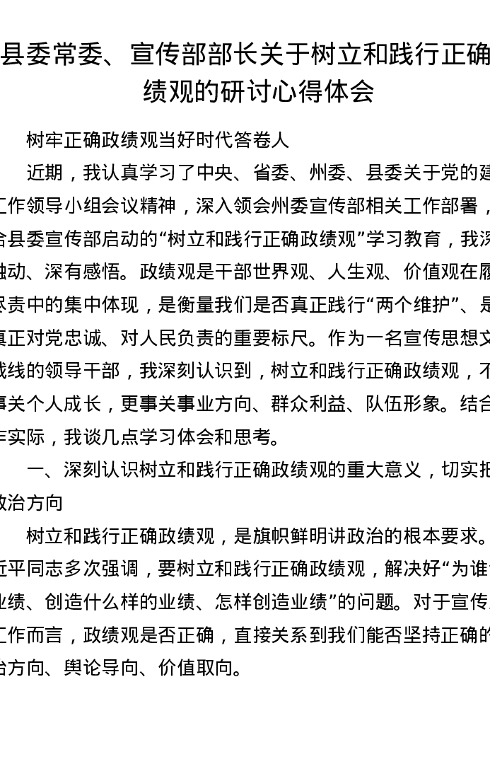 县委常委、宣传部部长关于树立和践行正确ZJG的研讨心得体会