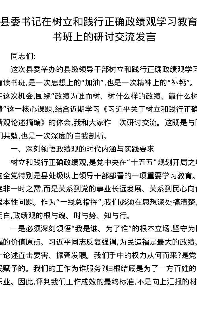 县委书记在树立和践行正确ZJG学习教育读书班上的研讨交流发言
