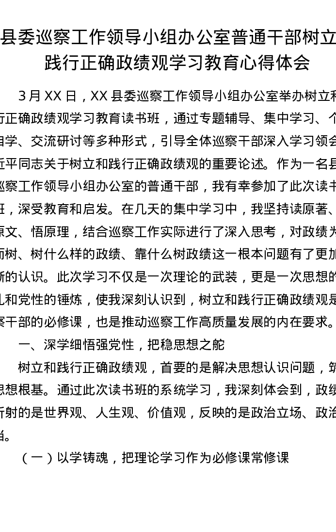 县委巡察工作领导小组办公室普通干部树立和践行正确ZJG学习教育心得体会