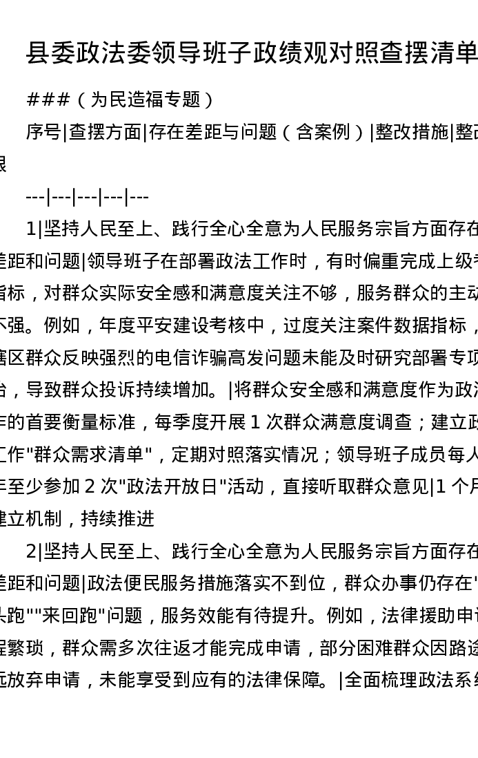县委政法委领导班子ZJG对照查摆清单(为民造福专题)