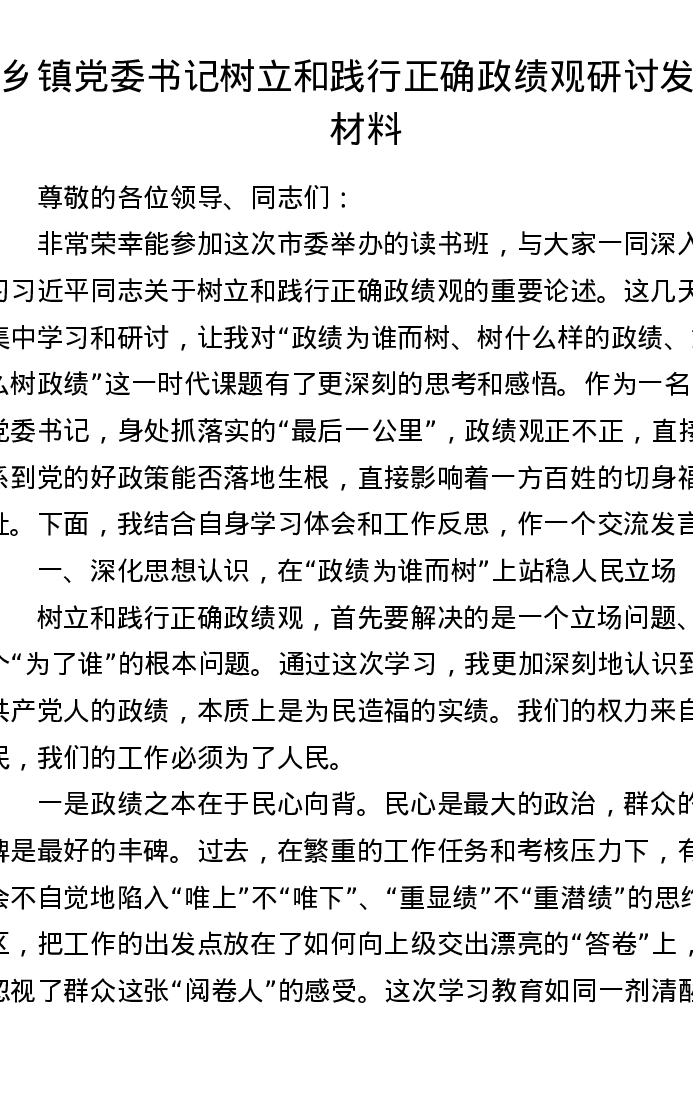 乡镇党委书记树立和践行正确ZJG研讨发言材料